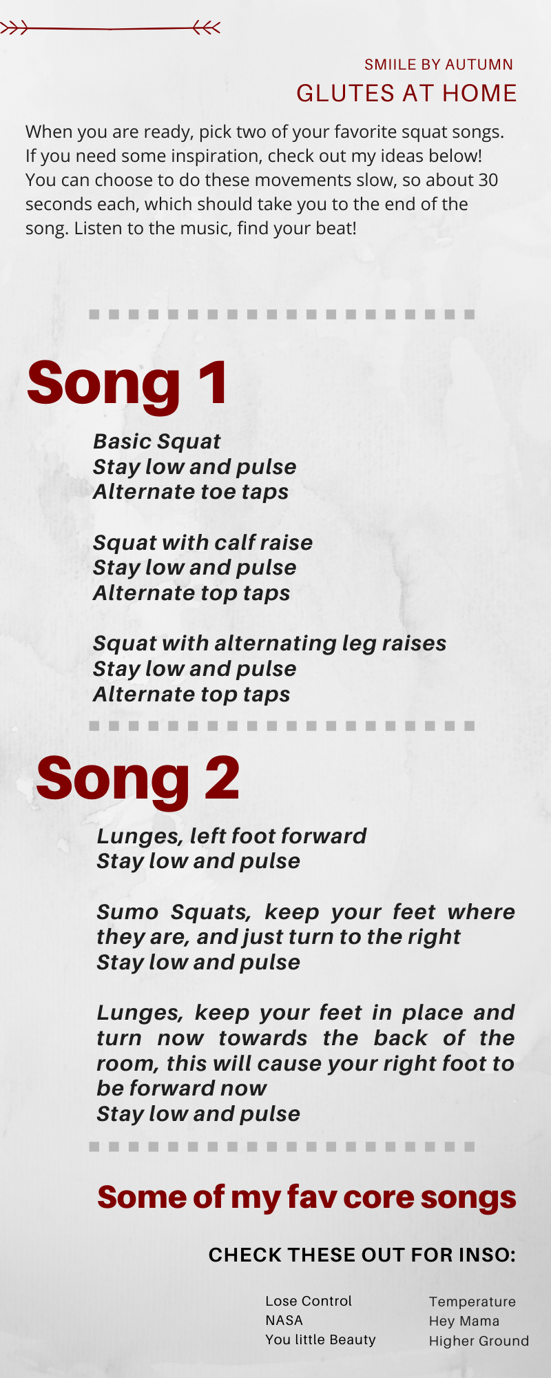 Scroll to the bottom of the page for the full glute workout that can be completed at home. Choose two of your favorite songs, I recommended finding songs that have good beats, and get started on your glute work!